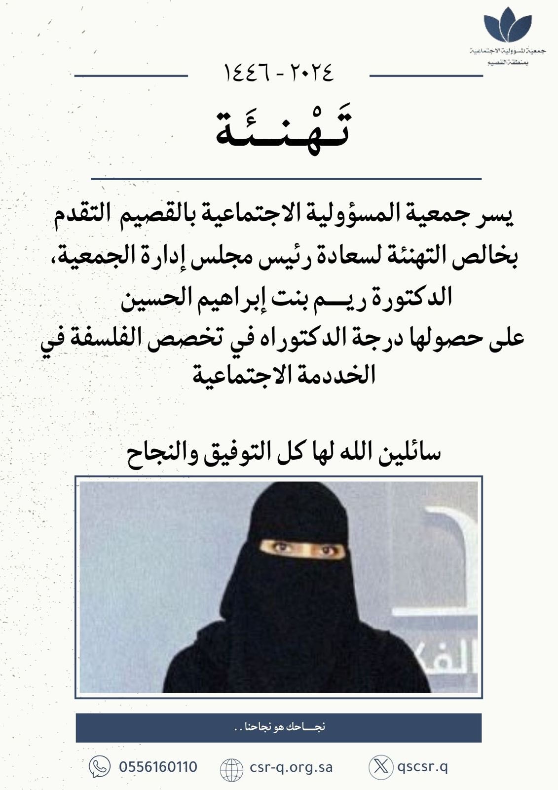 تهنئة رئيس مجلس إدارة الجمعية، د.ريم إبراهيم الحسين