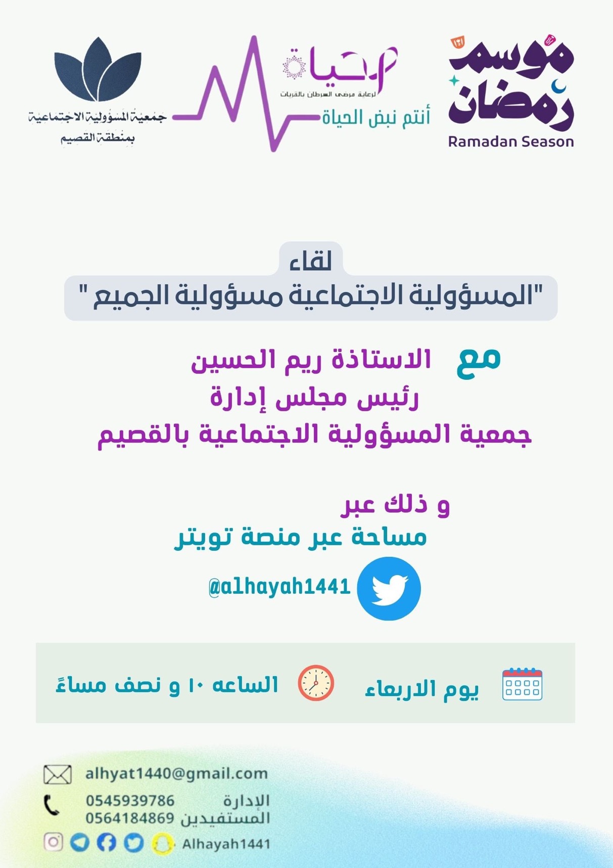 مساء هذا اليوم في مساحة صوتية لجمعية الحياة لرعاية مرضى السرطان بالقريات @Alhayah1441