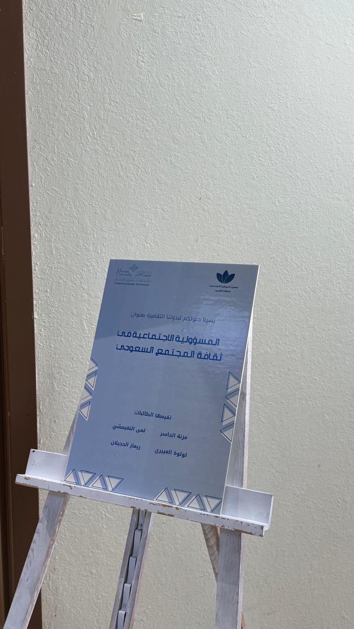 أقامت جمعية المسؤولية الاجتماعية ندوة بعنوان (المسؤولية الاجتماعية في ثقافة المجتمع السعودي) بالتعاون مع جامعة القصيم كلية اللغات والعلوم الإنسانية.